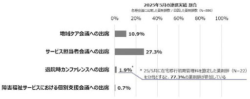 在宅支援体制を強化するには、多職種間の円滑な情報連携が不可欠です。しかし、日本総研の委託調査によると、薬剤師のサービス担当者会議への出席は27.3%、地域ケア会議への出席は10.9%にとどまっています。