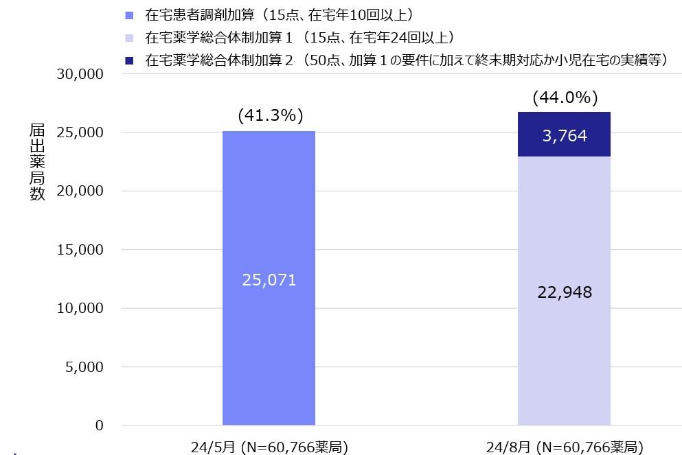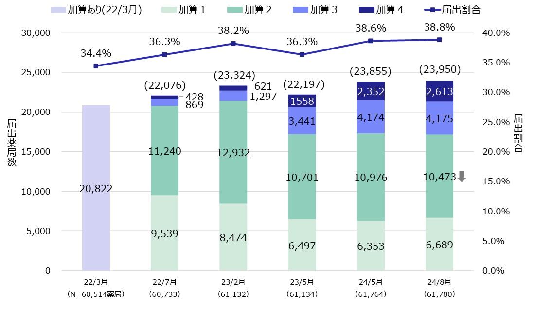 2024年度調剤報酬改定により、旧在宅患者調剤加算に代わる形で、在宅薬学総合体制加算1・2が新設されました。改定によって要件は厳格化したものの、届出件数は増加傾向にあります。