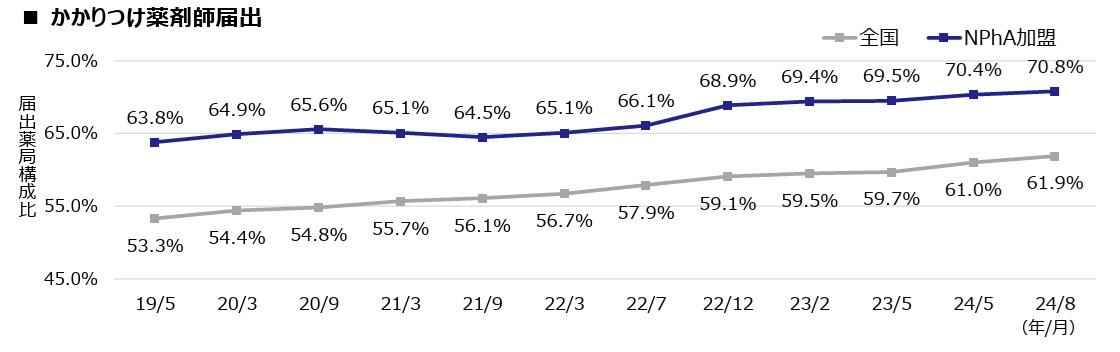 2024年度調剤報酬改定により、地域支援体制加算の算定には、かかりつけ薬剤師の届出が必須となりました。このような後押しもあり、かかりつけ薬剤師の届出は年々増加し、2024年8月時点では全国で61.9%に達しています。