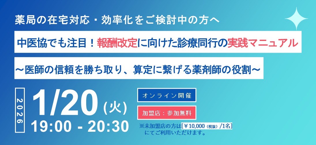 【1/20】中医協でも注目!報酬改定に向けた診療同行の実践マニュアル 〜医師の信頼を勝ち取り、算定に繋げる薬剤師の役割〜